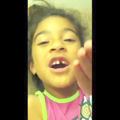"Kiss That Tooth Goodbye" A young girl wiggles her two loose teeth to the camera, blows a kiss, and one falls out at :14. Her eyes get big and she laughs when she realizes what happened.