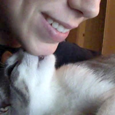 A cat tries nursing from a woman's chin indoors. She smiles. Cute.