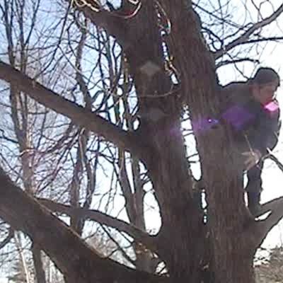 Young man climbs a tree and the branch he's on breaks. Caucasian.