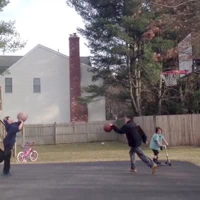 A young boy shoots a basketball outdoors, it misses the hoop, and hits a girl on a scooter in the head. Short tail.