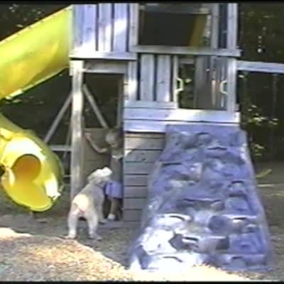 Dog jumps through small hole in a playhouse when boy calls dog's name from inside the playhouse.