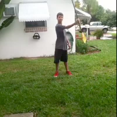 A teen boy swings/ spins a broom around outdoors, hits his leg, and falls down. Short tail.