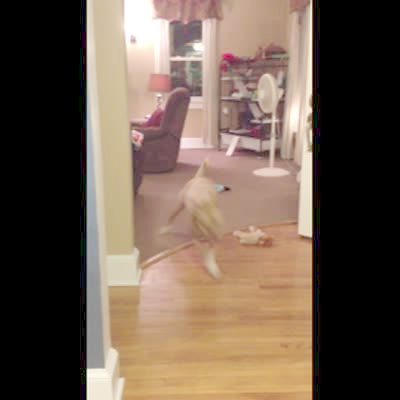 A pitbull dog leaves his toys on a floor and a white ferret walks out and pulls one toy off. The dog runs back, looks around, and leaves again, and the ferret sneaks back in and takes the other toy. The dog comes back and can't find his toys.