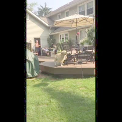 A golden retriever dog jumps after a ball in slow motion outdoors and the ball bounces off his nose, causing him to miss it.