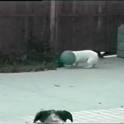 Dog: Terrier funs around backyard with ball balanced on head.
