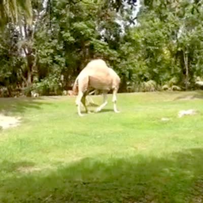 Camel at the zoo walking with his head hidden to the side making it seem he had no head.