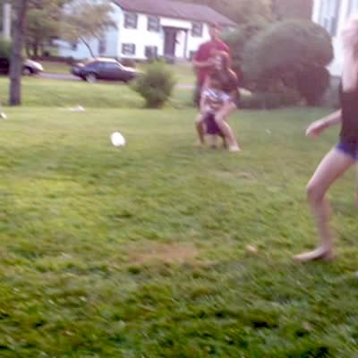 A teen girl is trying to leap frog over a teen boy, but he ducks, sending her flying. jump. yard