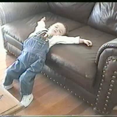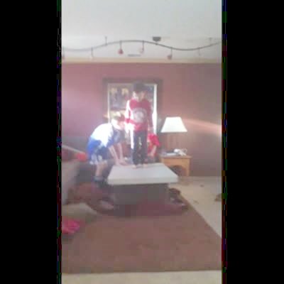 Young boy tries to jump off of table in living room. The table flips over and he falls.