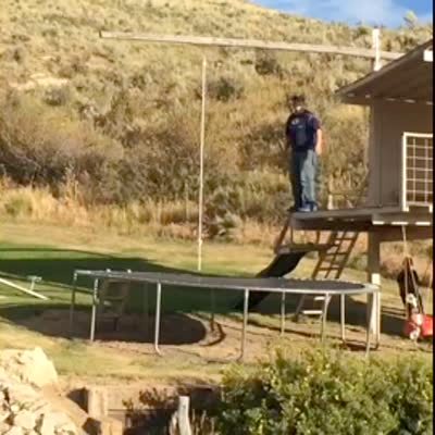 A man jumps from a deck to a rope swing hanging from a wooden post and the post cracks, causing the man to fall on a trampoline below.