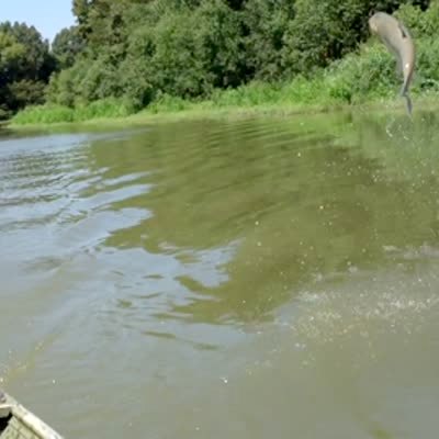A woman going down a river in a steel boat is terrified when an enormous fish jumps into it and starts flopping.
