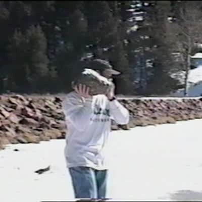 Teen boy starts to throw a big rock - he falls hard on ice instead. EXT. LAKE - ICE - WINTER - DAY