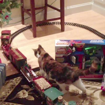 A cat is sneaking up on a Christmas train and then jumps and runs when train is turned on.