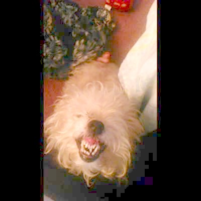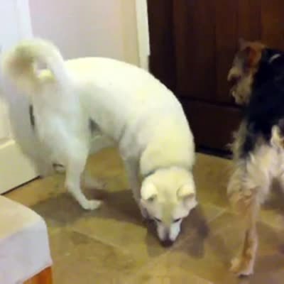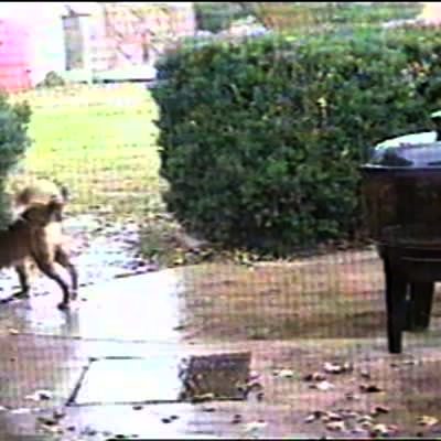 A dog sees his first Christmas tree indoors and when he lifts his leg to pee on it, and the girl behind the camera yells. AA: Christmas.