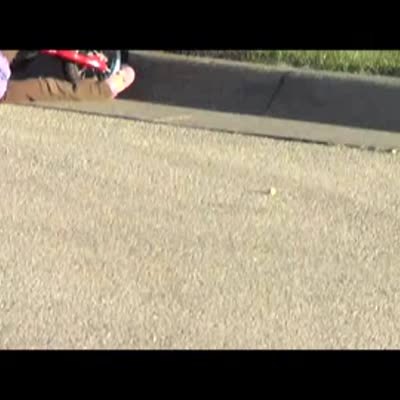 A young girl gets her bike caught on a young boy's bike and the boy crashes into/ hits his head on a mailbox.