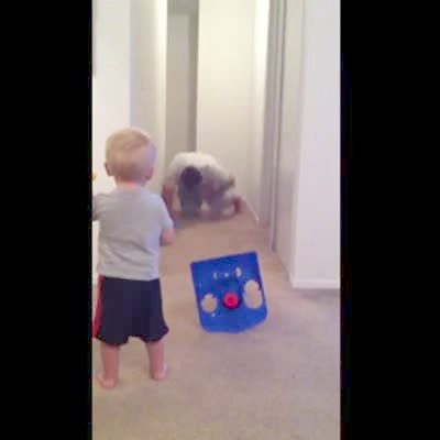 A man hoists a tot boy in a push car that he has tied to a pulley attached to the ceiling of a garage. The roof of the car comes off and the boy and the bottom of the car fall to the ground.