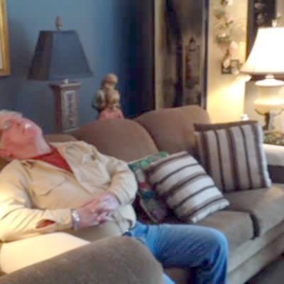 A teenage girl puts whipped cream in a man's mouth when he sleeps on a sofa with his mouth open.