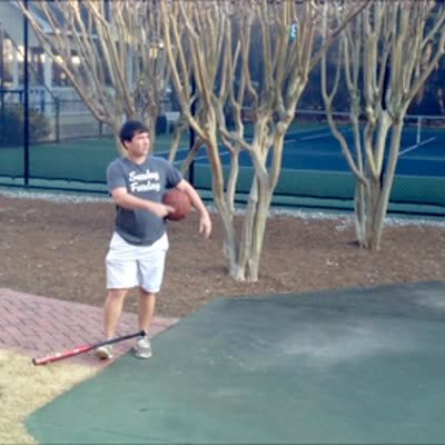 A teen boy shoots a basketball into a hoop with a baseball bat.