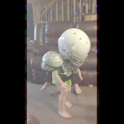 A tot boy wears a football helmet and shoulder pads as a young boy throws a football to him, but the second throw hits the tot boy in the face and he falls down indoors.