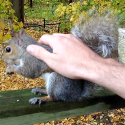 A squirrel makes a strange noise while eating an acorn outdoors as someone pets it. What's that sound.