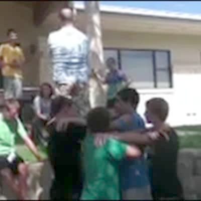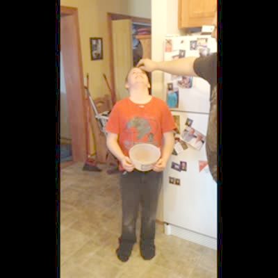 The teenage boy behind camera tricks his younger brother into thinking he's late for school and hides his backpack before he learns from his dad on the phone that school is canceled for a snow day.