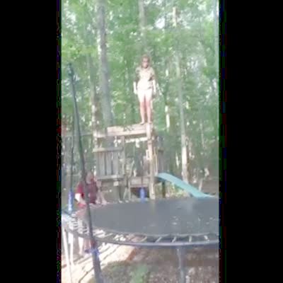 A teen girl jumps from a swing set onto a trampoline and falls through when the trampoline rips and tears.