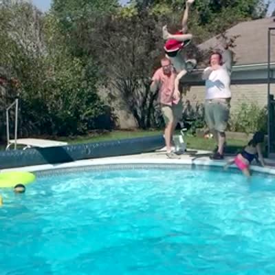 Two men throw a young boy in to a swimming pool and one of the men also falls in. Slow motion video.