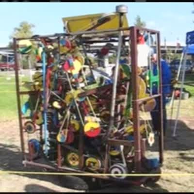 Weird machine in park spins around with hundreds of moving parts, making duck quacking sounds. Odd visual. Invention. Long for edit.