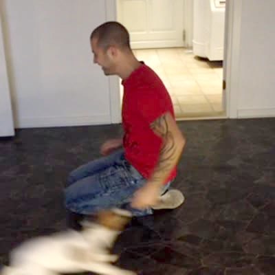 A man spins a dog around by a rope that the dog holds onto with its teeth at home.