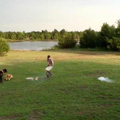A teen boy lights a firework outdoors when his dad throws a lit firework behind him that scares him as he does a funny dance and runs away.