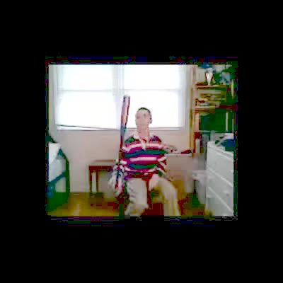 Teen boy sits watching TV & simultaneously balances a baseball bat on his finger, but the bat falls & hits him in the head.