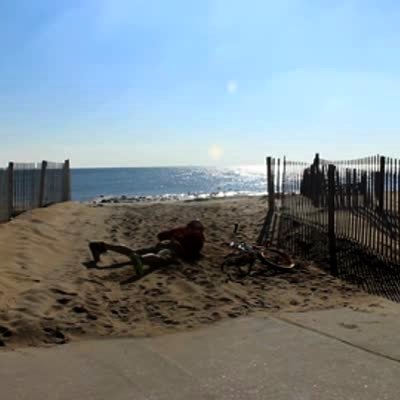 A man goes for a jump over a fence on his bike and hits it falling onto the sand. Action at :06