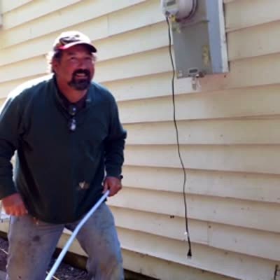 A man bangs on a broken piece of siding outside his house with a broom and a bat flies out and scares him. He continues to bang on the siding and as more bats fly out, he gets more and more startled and begins shaking his broom around at them.