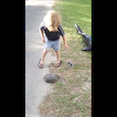 A young boy picks up a turtle outdoors when it pees on him and he drops it.