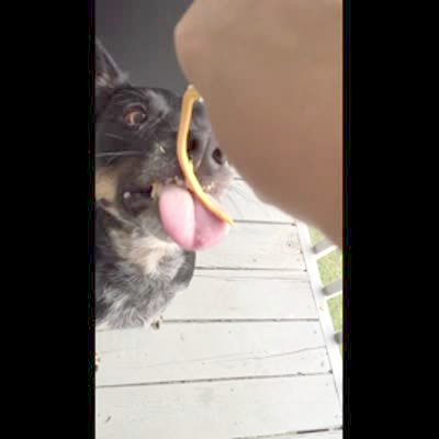 Dog drinks rain that drips off the roof. Dog bites at the water as it falls down.