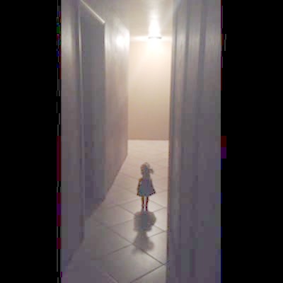 A scary doll stands in a hallway indoors as a man and woman call their sons to come see something. Two boys see the doll and scream. One runs away while the other kicks the doll.