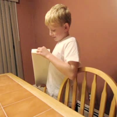 At 9 seconds in, a boy hits himself in face on accident with the present he is trying to open.