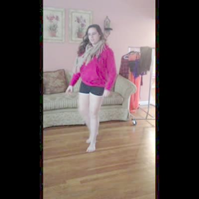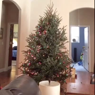 A teen girl jumps at her Christmas tree and knocks it over indoors. Vine/Instagram.