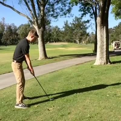 A teen boy hits a golf ball at a tree outdoors and it bounces off the tree and hits the boy in the groin in slow motion.