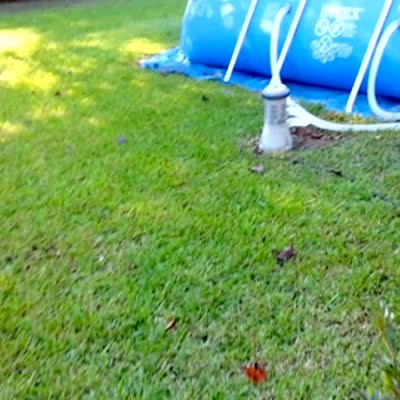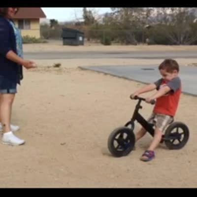 A young boy can't control a leaf blower. The forced air causes him to spin in circles until his dad stops him.