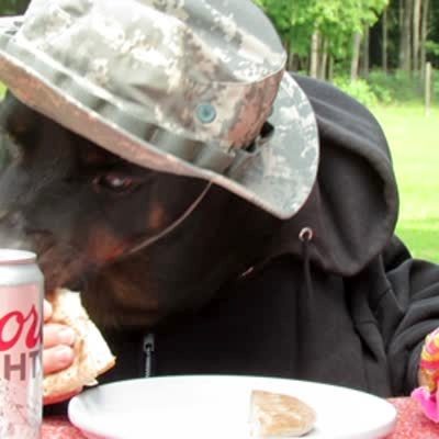 A dog with human hands eats a sandwich and then licks a popsicle while sitting at a table outdoors.