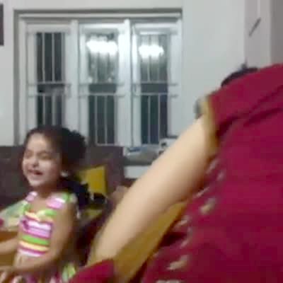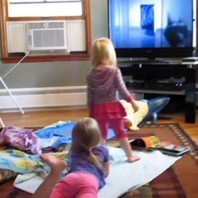 A young girl screams/ cries on the floor whenever her tot sister stands between her and the TV and stops when she steps away.