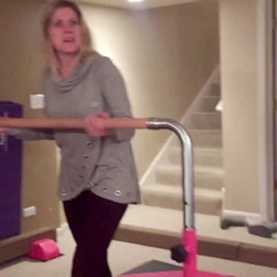 A young teen girl teaches a woman how to do a routine on a gymnastics bar in the basement and then at 0:47, the woman does it and falls off the bar.