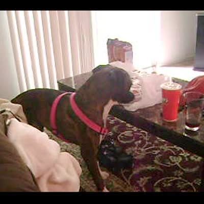 A boxer dog is getting into food on coffee table. Woman catches him and dog looks wide-eyed at camera.