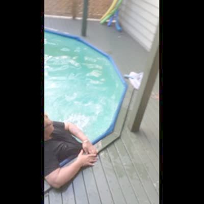 A woman cleans a pool outdoors when a woman behind the camera scares her and the cleaning woman falls out of the pool.