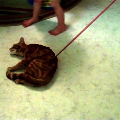 An orange cat looks uncomfortable in a kitchen when a man drags him with a cat leash.