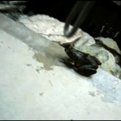 Big frog jumps at the strap on man's camera, bites man's finger & hangs on for a few seconds. Man screams & gets scared.