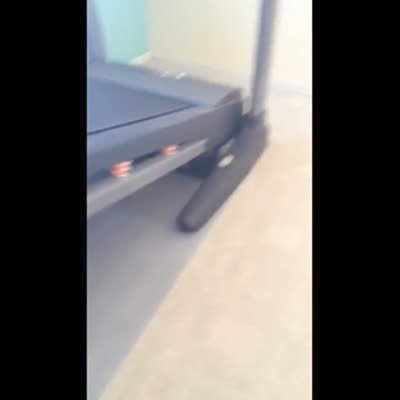 A man lifts up a treadmill indoors when a squirrel runs out, crashes into a mirror, runs back, then crashes into the mirror again as the man yells at the squirrel to get out. He crawls back under the treadmill and continues to crash into the mirror repeatedly each time the man lifts it up. Finally it climbs up to a window and jumps out.
