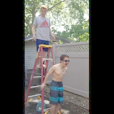 A teen boy drops a large water balloon on another teen's head but it doesn't pop.