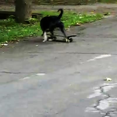 Black and white dog plays with a skateboard and rides on it in the driveway.
