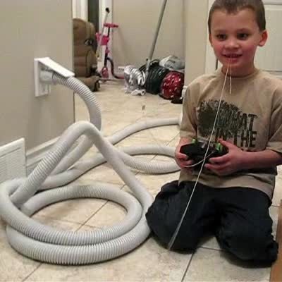 Little boy pulls his loose tooth out with a remote controlled skateboard toy. It comes out and he smiles. Short clip. Teeth.